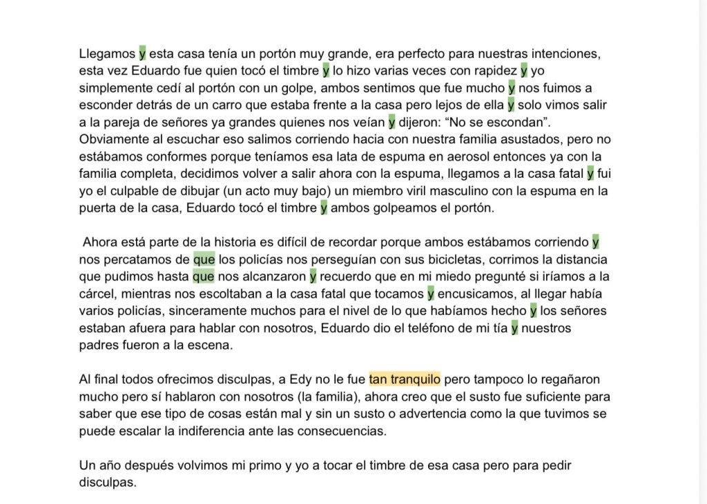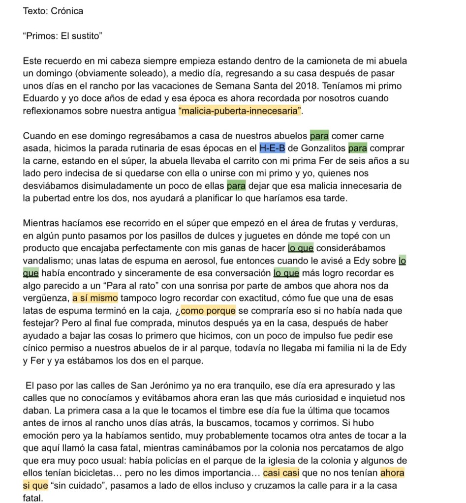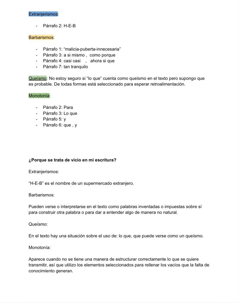 Igual que en la actividad pasada, se utilizaron colores subrayando las palabras que representaban dichos vicios para poder identificarlos de mejor manera.